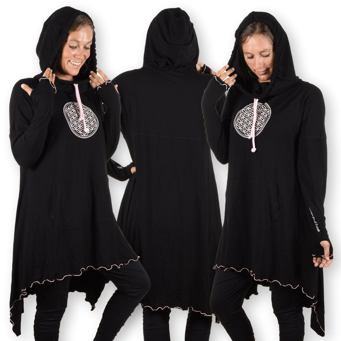 1. Möt Sigrid, en av våra bästa plagg som har följt med i flera år i olika färg kombinationer. Här med rosa tryck och detaljer. Oversize med ficka fram och hål för tummarna. Broderi på ärmen med "I am grateful for all I create". Tillverkad i skön viskos/elastan på en familjefabrik i Grekland. Limiterad upplaga - 70 st! ord. pris 2444kr.