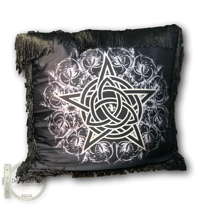 Ge ditt hem en djup, sofistikerad känsla med mitt lyxiga kuddfodral i satin med svart botten – en design som utstrålar mystik och elegans. Framsidan bär mitt eget unika tryck, skapat här i Sverige: ett kraftfullt möte mellan pentagram, keltisk knut och fransk lilja, vävt samman med ett vackert blommönster som kontrasterar perfekt mot den mörka grunden. Långa, svepande fransar runt om ger en dramatisk och detaljrik känsla, medan baksidan i lyxig svart sammet med klädda knappar fulländar det exklusiva intrycket.